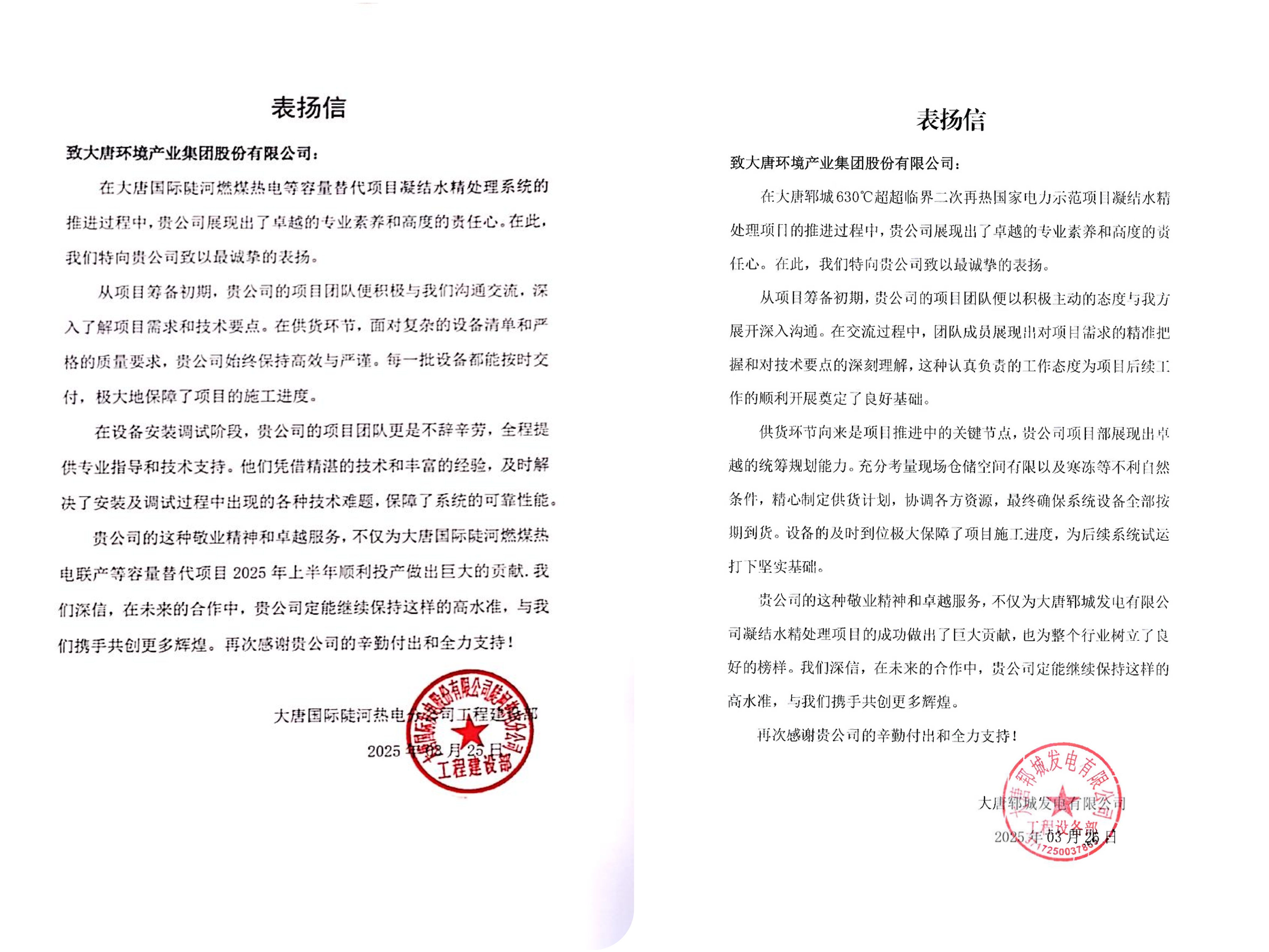 本网讯 近日,水处理事业部凭借在陡河项目与郓城项目中的卓越表现,接连收到两封业主发来的表扬信。信中对我方团队展现出的专业实力、服务精神及执行效率给予高度评价。