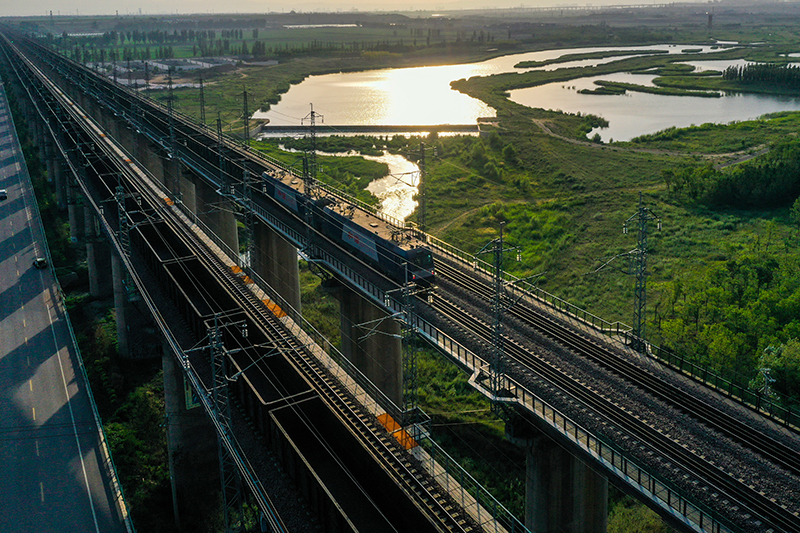 重载列车行驶在大秦铁路上(2022年7月16日摄,无人机照片)。为做好迎峰度夏能源保供工作,中国铁路太原局集团有限公司在确保运输安全的前提下全力提升煤炭运量。新华社记者 曹阳 摄