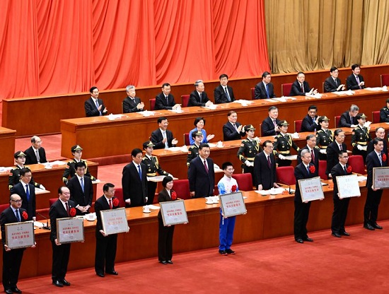 在欢快的乐曲声中,习近平等为受表彰的个人和集体代表颁奖。
