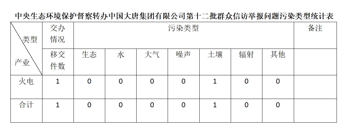 2025年6月16日,中央第七生态环境保护督察组向中国大唐集团有限公司移交第十二批群众信访举报件,共计1件,为来信举报,涉及土壤问题1个。所有举报件办理工作已第一时间进入调查核实办理程序,办理情况将按照相关要求反馈督察组,并及时向社会公开。