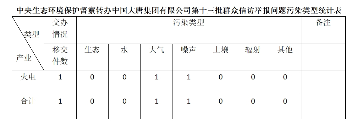 2025年6月19日,中央第七生态环境保护督察组向中国大唐集团有限公司移交第十三批群众信访举报件,共计1件,为来电举报,涉及大气问题1个、噪声问题1个。所有举报件办理工作已第一时间进入调查核实办理程序,办理情况将按照相关要求反馈督察组,并及时向社会公开。