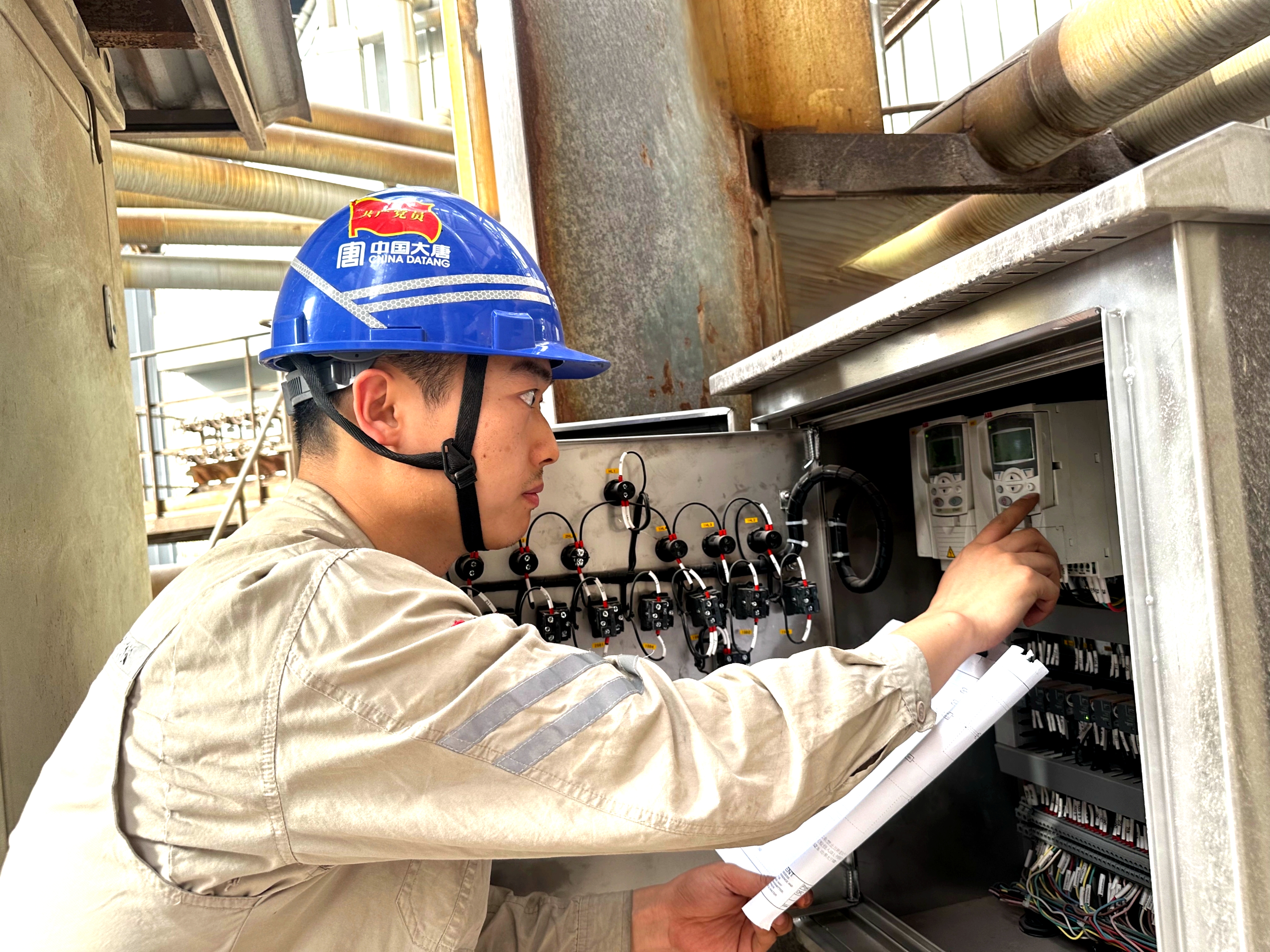 两人伏身在控制柜前,汗水在安全帽沿凝成细珠,保持着细致与专注,把匠心注入每一处接线,为启动做好无声的铺垫。