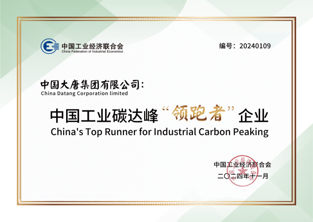 中国大唐荣获中国工业碳达峰“领跑者”企业称号