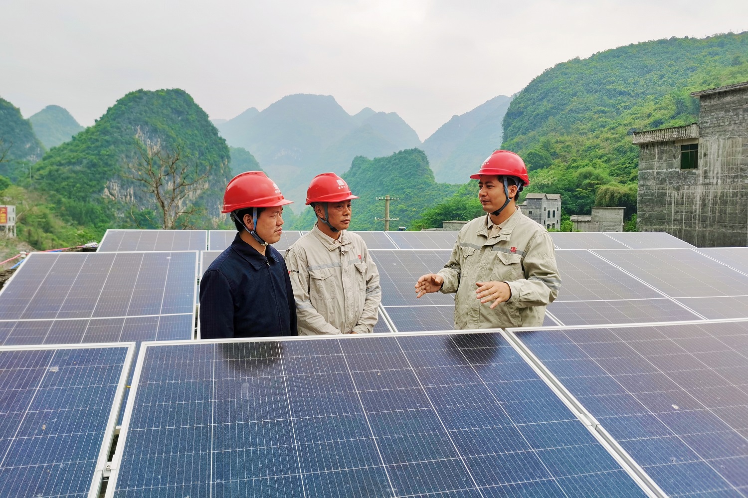 驻村工作队与施工单位人员正在查看光伏板安全情况